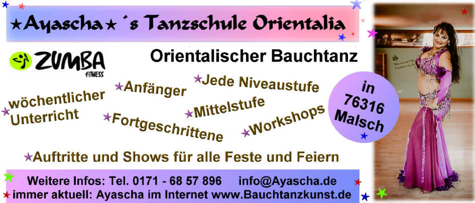 die Tanzschule Orientalia in Malsch bei Karlsruhe, Baden-Baden, Rastatt und Pforzheim und über Zumba Fitness, Hawaiianische Hulatänze und Otea.