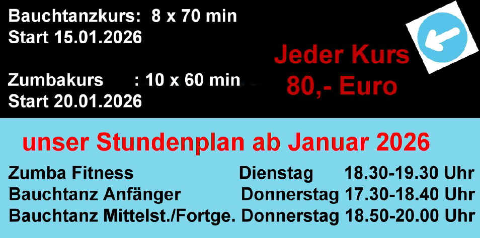 Wöchentlicher Bauchtanzunterricht, Hawaiian Hula-Unterricht und Workshops, auch Zumba (für Erwachsene, Zumba Gold, ZumbAtomic für Kinder und Aqua Zumba)